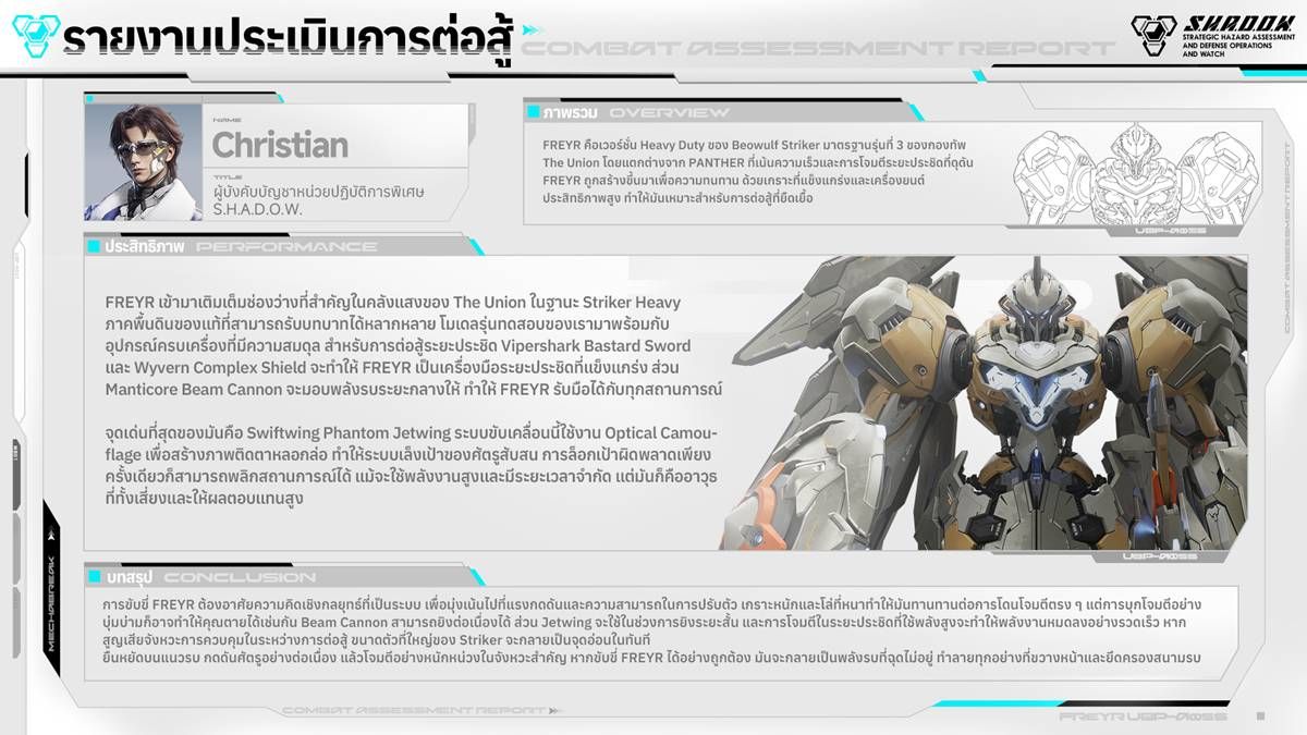 Mecha BREAK กำลังจะเปิดตัว Heavy Attacker ตัวแรก FREYR ในฐานะ Line Breaker ที่ติดตั้งอาวุธได้หลากหลาย เช่น ปืนใหญ่ ดาบ และโล่ ทำให้ FREYR โดดเด่นในการต่อสู้ระยะประชิดพร้อมกับกดดันการต่อสู้ในระยะกลางได้อย่างทรงพลัง การสับเปลี่ยนอาวุธได้อย่างยืดหยุ่นทำให้สามารถปรับเปลี่ยนสไตล์การรบได้อย่างอิสระ ในขณะที่ระบบขับเคลื่อนประสิทธิภาพสูงและเกราะหนักจะช่วยให้รอดชีวิตจากการปะทะกันตรง ๆ แม้ต้องเผชิญหน้ากับ Heavy Attacker คนอื่น ๆ นับตั้งแต่เปิดตัว FREYR ได้พัฒนาอย่างรวดเร็วเพื่อรองรับรูปแบบการใช้งานอาวุธที่หลากหลาย ตั้งแต่สายต่อสู้ระยะประชิดไปจนถึงสายปืนใหญ่ โดยมีการสร้างสมดุลที่ลงตัวระหว่างพลังการยิง การเคลื่อนไหว และกลยุทธ์ที่ยืดหยุ่น