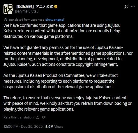 ในแถลงการณ์ผ่านบัญชี X (Twitter) ทางทีมงานระบุว่า มีเกมมือถือหลายเกมที่แอบอ้างนำภาพ ตัวละคร และเนื้อหาของ Jujutsu Kaisen ไปใช้ดื้อ ๆ โดยไม่ได้รับอนุญาต ซึ่งถือเป็นการละเมิดลิขสิทธิ์แบบเต็ม ๆ พร้อมเตือนแฟน ๆ ว่า "อย่าหาทำ" ไปโหลดมาเล่นเด็ดขาด โดยตอนนี้ทางทีมงานกำลังไล่บี้แจ้งลบเกมพวกนี้ออกจากสโตร์ให้หมด