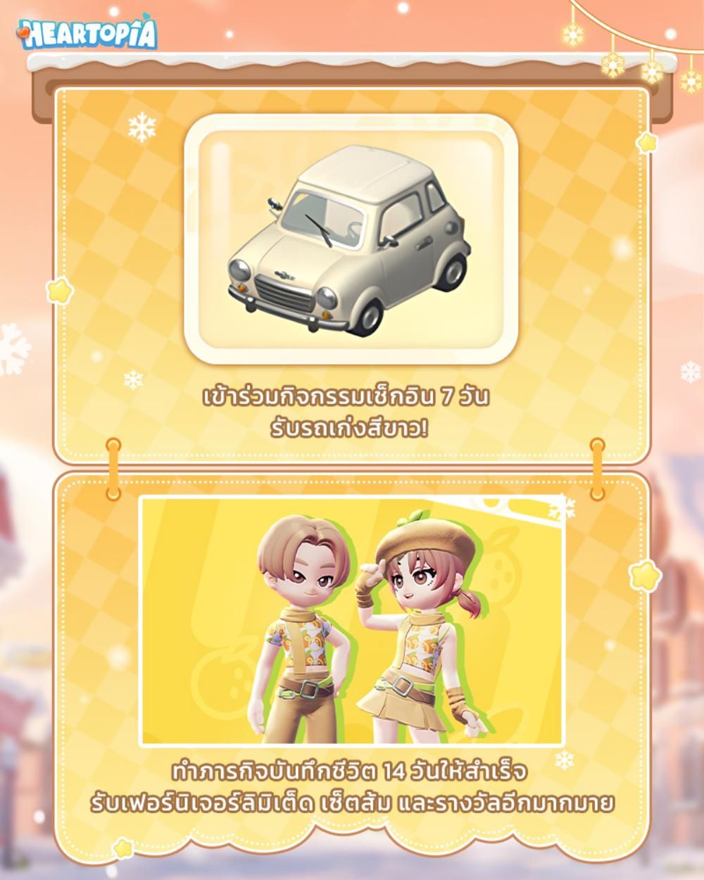 • เช็กอินครบ 7 วันรับไปเลย: รถเก๋งสีขาว เฟอร์นิเจอร์และคอสตูมฟรี พร้อมรางวัลอื่นๆ อีกมากมาย!