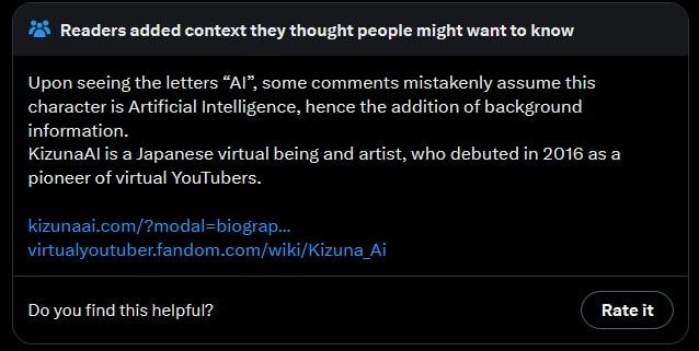กระแสความเข้าใจผิดนี้รุนแรงจนกระทั่งระบบ Community Note (บริบทเพิ่มเติมโดยผู้อ่าน) ของทาง X ต้องทำงาน โดยขึ้นข้อความแปะใต้โพสต์เพื่อแก้ต่างให้ว่า Kizuna AI ไม่ใช่โปรแกรม Generative AI อย่างที่หลายคนกลัว แต่เธอคือ "Virtual YouTuber" หรือ VTuber คนแรกของโลกที่เดบิวต์มาตั้งแต่ปี 2016 ซึ่งเป็นเวลานานก่อนที่กระแส AI วาดรูปจะถือกำเนิดขึ้นเสียอีก