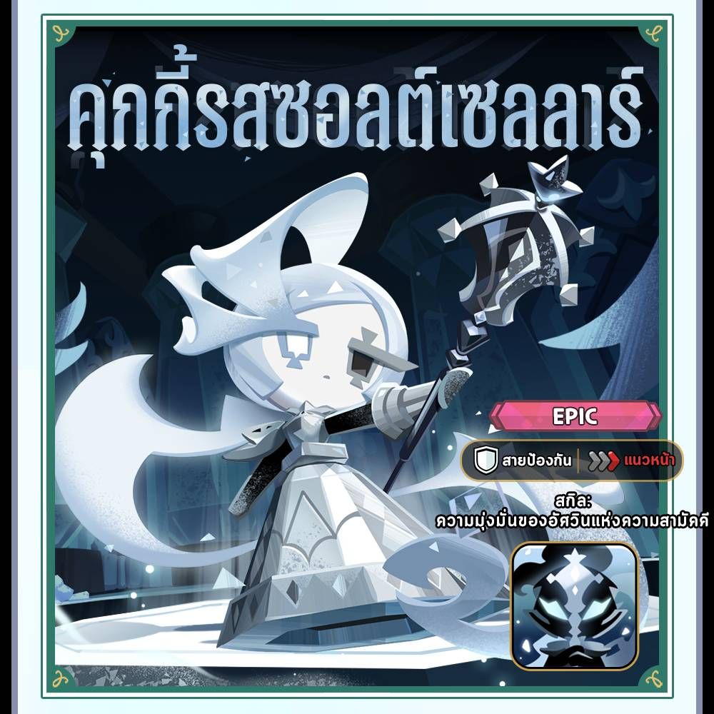 ส่วนคุกกี้รสซอลต์เซลลาร์ที่ผู้เล่นจะได้พบเจอในอัปเดตนี้ จะเป็น คุกกี้สายป้องกันในระดับ Epic ที่มีประวัติเป็นสมาชิกของคณะอัศวินกาลานามัค ซึ่งคอยปกป้องส่วนลึกของสุสานใต้ดินอยู่เพียงลำพัง เธอมาพร้อมสกิลที่สามารถโจมตีศัตรูและเรียกอัศวินกาลานามัคออกมาได้ถึงสี่ตัว และยังสามารถมอบบัฟโล่พลังชีวิตให้กับเพื่อนร่วมทีม พร้อมถอดถอนเอฟเฟกต์จากกติกาดินแดน และมอบบัฟภูมิคุ้มกัน รวมไปถึงบัฟลดความเสียหายให้