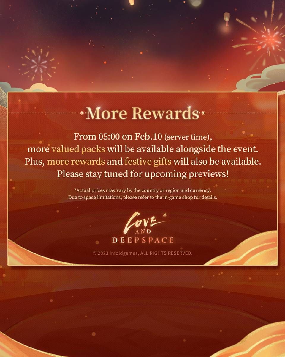 เมื่อเข้าร่วมกิจกรรม ผู้เล่นจะสามารถปลดล็อกเนื้อเรื่องและรางวัลสุดพิเศษมากมาย เช่น Deepspace Wish, ชุดประจำวัน “ของฉัน”, เครื่องประดับ, ของตกแต่งลิมิเต็ด และอื่น ๆ อีกมากมาย นอกจากนี้ เมื่อสะสมชิ้นส่วน Intel ครบตามจำนวนที่กำหนด ผู้เล่นจะได้รับ Floral Invite จากตัวละครคู่รักอีกด้วย
