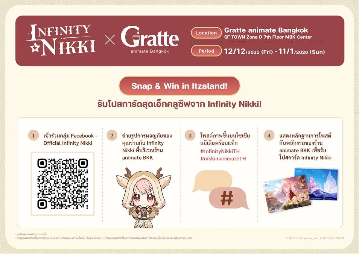 - โพสต์ลงโซเชียลมีเดียพร้อมแฮชแท็ก: #InfinityNikkiTH #nikkiinanimateTH [รองรับแพลตฟอร์ม: Facebook, Instagram, X, TikTok (ไม่รวม Stories)]
