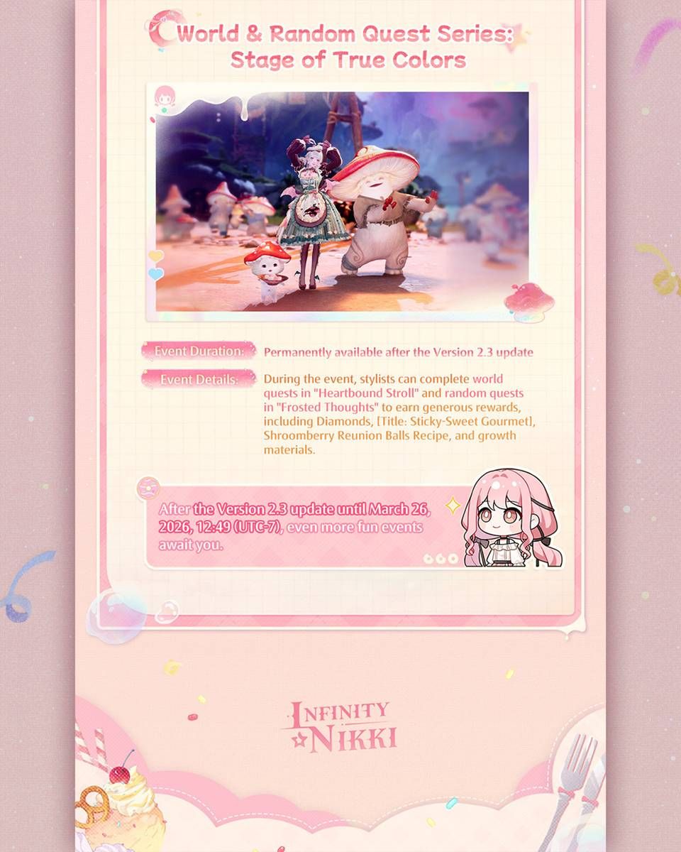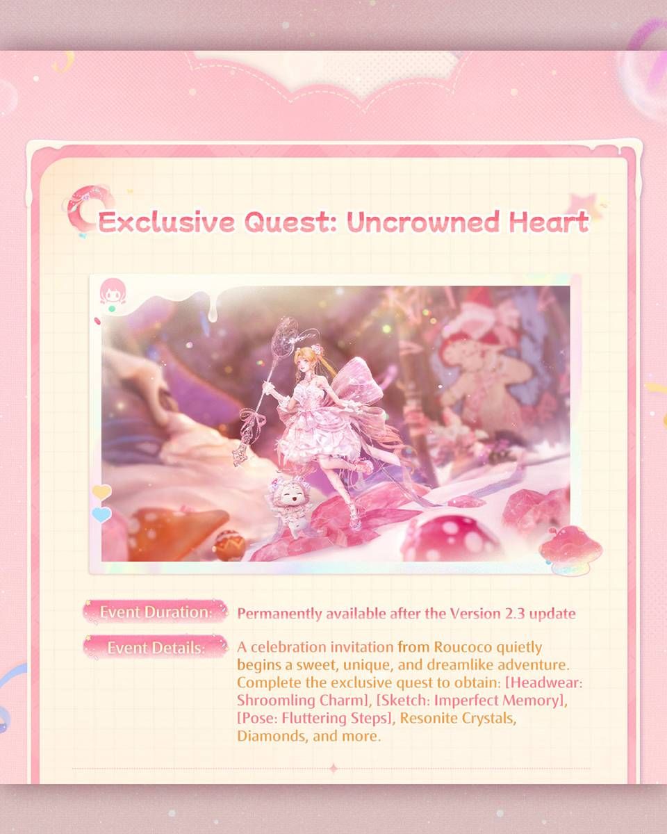 คำเชิญร่วมงานเฉลิมฉลองจาก Roucoco ได้เปิดฉากการผจญภัยที่หวานละมุน แปลกใหม่ และราวกับความฝันขึ้นอย่างเงียบ ๆ ทำเควสต์พิเศษนี้ให้สำเร็จเพื่อรับ [Headwear: Shroomling Charm], [Sketch: Imperfect Memory], [Pose: Fluttering Steps], Resonite Crystals, Diamonds และรางวัลอื่น ๆ อีกมากมาย - ชุดเควสต์โลก & เควสต์สุ่ม: Stage of True Colors