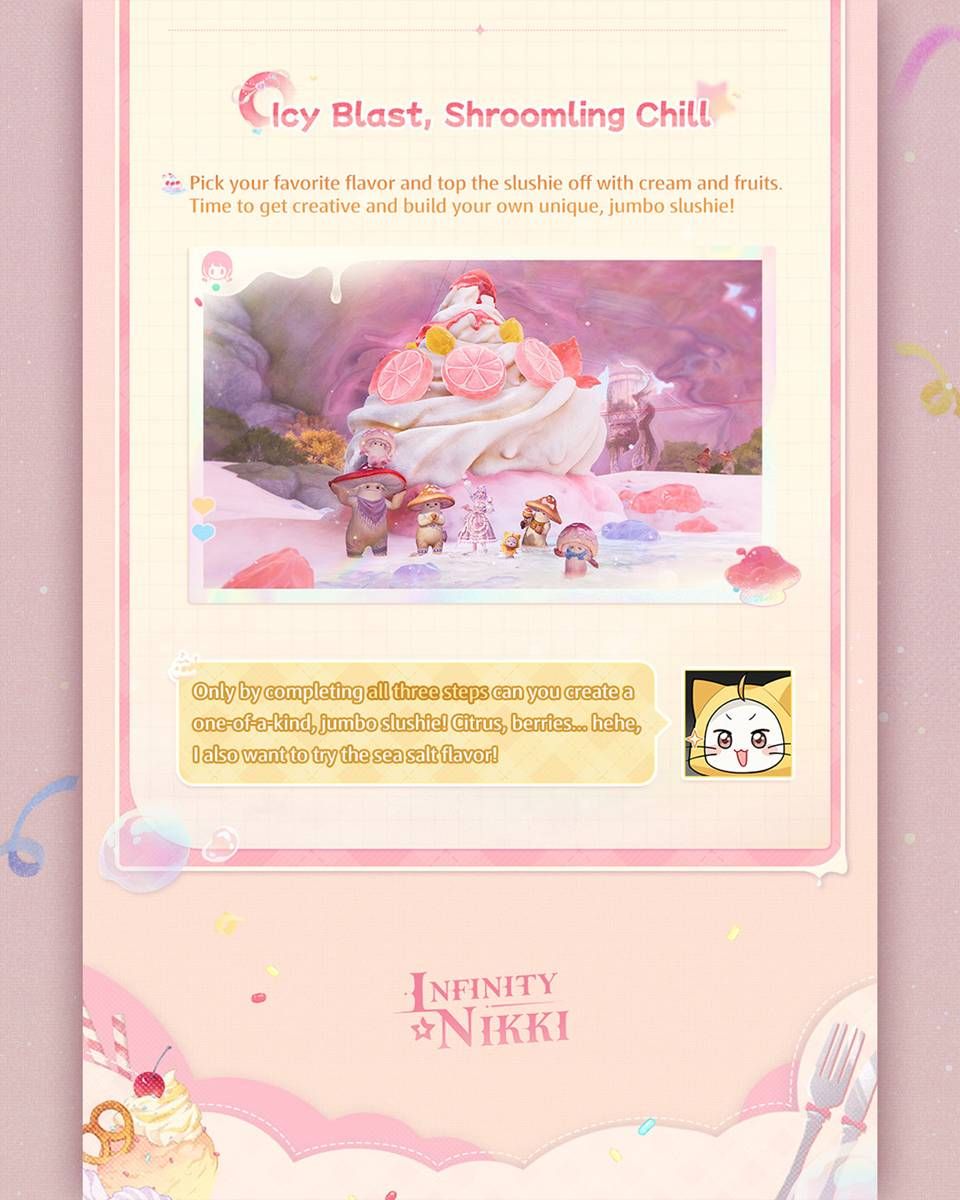 ในช่วงกิจกรรม เหล่าสไตลิสต์สามารถไปที่ Perfect Idol: Champion’s Celebration และพูดคุยกับ Eltott บริเวณข้าง zipline เพื่อเริ่มต้นความท้าทาย เล่นกิจกรรมเพื่อรับ Diamonds, วัสดุพัฒนาต่าง ๆ และรางวัลอื่น ๆ อีกมากมาย - กิจกรรม: Icy Blast, Shroomling Chill
