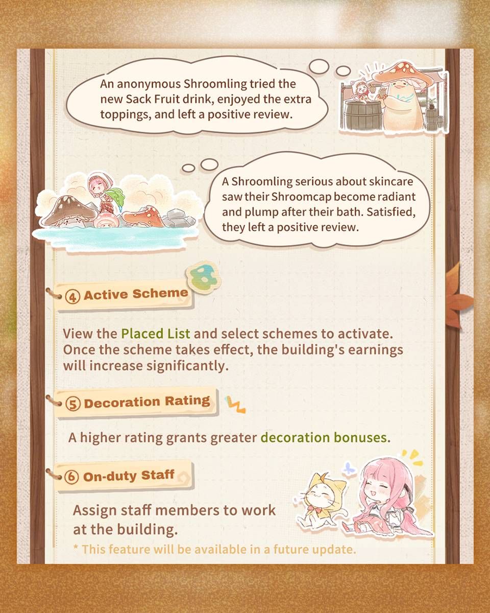 ในช่วงกิจกรรม เหล่าสไตลิสต์สามารถไปที่ Perfect Idol: Champion’s Celebration และพูดคุยกับ Eltata บริเวณข้าง Shroomling Bathhouse เพื่อเริ่มต้นความท้าทาย เล่นกิจกรรมเพื่อรับ Diamonds, วัสดุพัฒนาต่าง ๆ และรางวัลอื่น ๆ อีกมากมาย - กิจกรรม: Combo Joy, Shroomling Fun