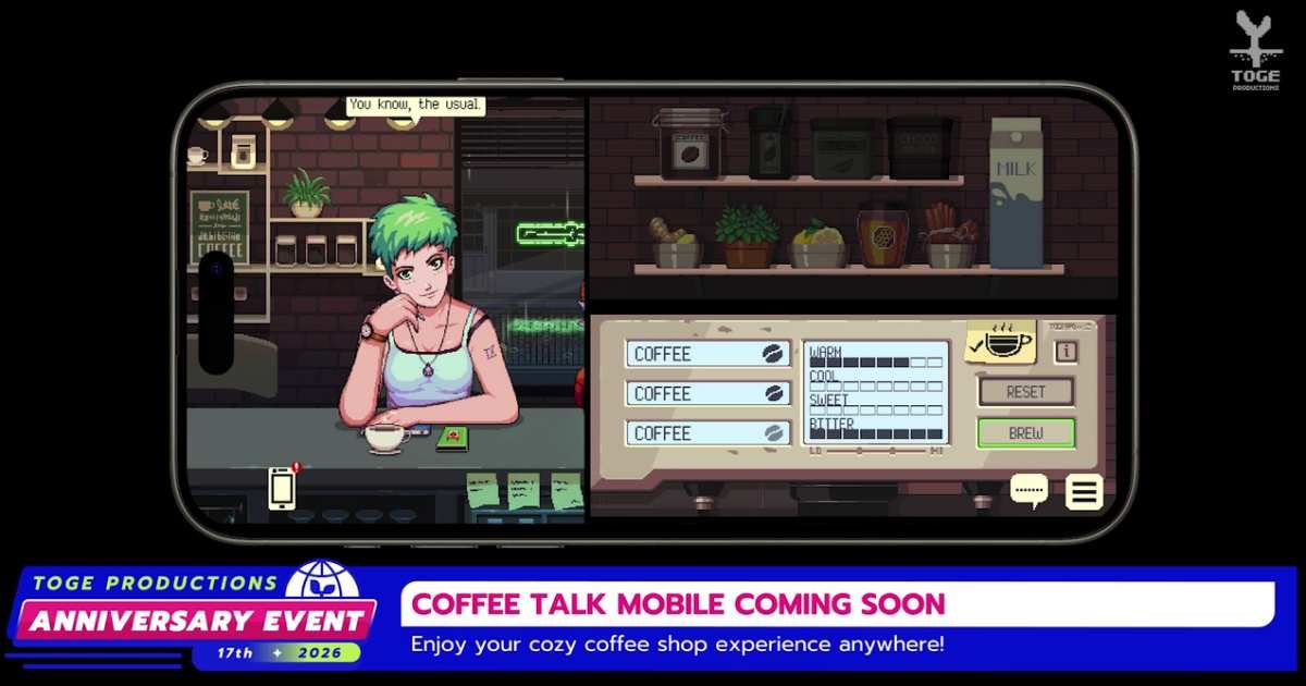 เหล่าเกมเมอร์ผู้รักในกาแฟเตรียมมือถือกันไว้ให้พร้อม! เมื่อล่าสุดใน Toge Productions 17th Anniversary Direct ที่ได้มีการถ่ายทอดสดไปในช่วงตีหนึ่งของวันที่ 16 มกราคม ที่ผ่านมานั้นนอกจากจะมีการเปิดเผยอัปเดตต่าง ๆ เทศกาลลดราคา(ทั้งบันเดิลและเกมเดี่ยว) ทางผู้พัฒนา Toge Productions ก็ได้มีการเผยข่าวสุดน่าตื่นเต้นอย่างการเตรียมนำ Coffee Talk เกมแนว Simulation บรรยากาศสบาย ๆ ที่จะให้เราได้มารับบทบาทเป็น Barista ผู้ที่จะได้มารับฟังเรื่องราวของผู้คนท่ามกลางกลิ่นหอมกรุ่นของกาแฟ มาลงให้กับมือถือ!