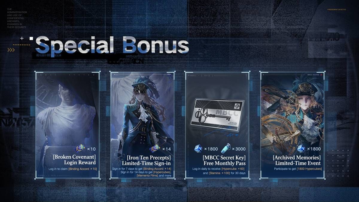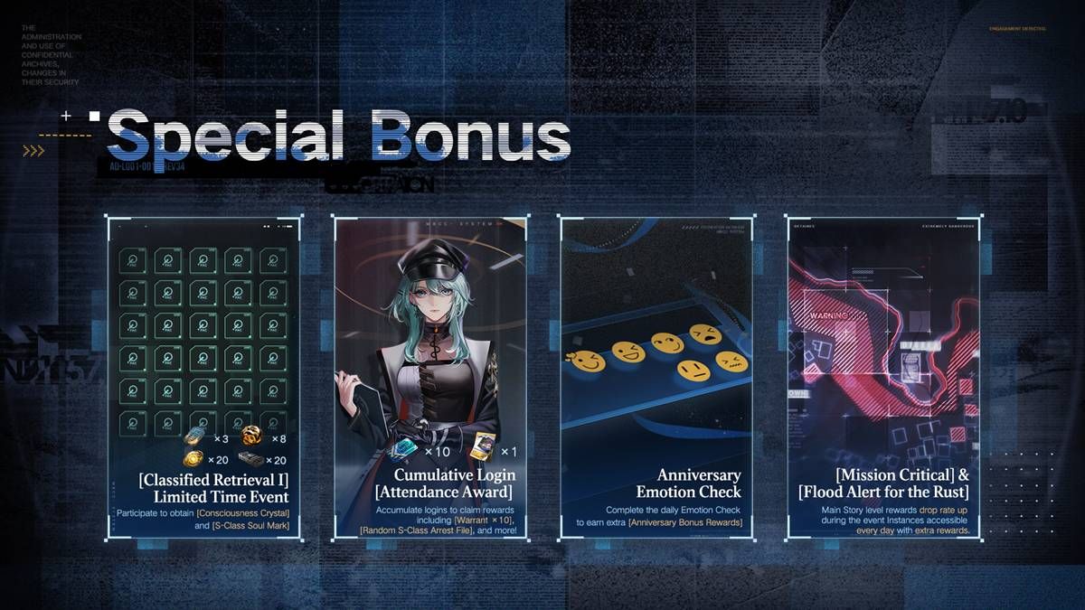 ในไลฟ์สดยังมีการเปิดเผยของรางวัลฉลองครบรอบสุดคุ้มมากมาย ผู้เล่นจะได้รับ ตั๋วสุ่มฟรี 10 ครั้ง เมื่อเข้าสู่เกม และหากล็อกอินต่อเนื่องจะได้รับเพิ่มอีก 14 ครั้ง นอกจากนี้ยังมีรางวัลใหญ่เพิ่มเติมอย่าง Monthly Pass ฟรี และ S-Class Sinner แบบเลือกได้ อีกด้วย โดยคาดว่าผู้เล่นจะสามารถรับตั๋วสุ่มฟรีรวมกันได้มากกว่า 50 ครั้ง และสำหรับผู้เล่นใหม่ ยังสามารถรับเพิ่มอีก 60 ครั้ง จากภารกิจเริ่มต้น ทำให้งานฉลองครบรอบครั้งนี้เต็มไปด้วยของรางวัลมากมายและความคุ้มค่าสุดๆ!