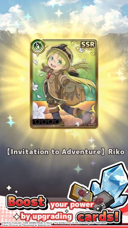 - สะสมและอัปเกรดการ์ดตัวละครจากผลงานสุดโด่งดังอย่าง Made in Abyss เพิ่มเลเวลเพื่อยกระดับพลังในฐานะ Cave Raider!
