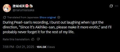 โดยเธอได้โพสต์เล่าผ่าน X (Twitter) ว่า ในระหว่างการอัดเสียง Pearl เธอได้รับบรีฟจากผู้กำกับเสียงว่า "ไหน ๆ ก็เป็นคุณไอซากะแล้ว... ช่วยพากย์ให้มัน 'เอโระ' (เซ็กซี่/ติดเรท) กว่านี้อีกได้ไหมครับ" ทำเอาเธอถึงกับขำลั่นออกมา และบอกว่านี่เป็นเรื่องที่เธอคงไม่มีวันลืมแน่นอน