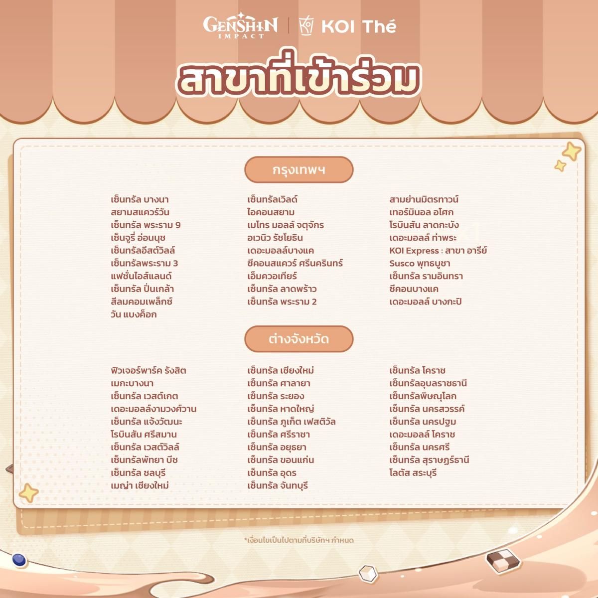 สาขาที่เข้าร่วมกิจกรรมคอลแลปส์ Genshin Impact x KOI Thé "The Taste of Joy"