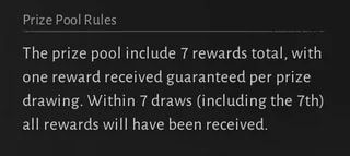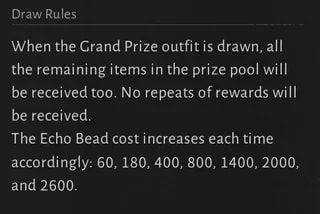 โดยการสุ่มจะเริ่มต้นด้วยราคาที่ดูแล้วถูกอย่างเหลือเชื่อ เพียงแค่ 60 Echo Beads (หน่วยเงินพรีเมียมในเกม) แต่ในรอบถัด ๆ ไป ราคาจะกระโดดขึ้นเป็น 180, 400, 800, 1,400, 2,000 และจบที่รอบสุดท้ายซึ่งต้องใช้มากถึง 2,600 Beads ซึ่งระบบการันตีว่าหากหมุนครบ 7 ครั้งจะได้ของรางวัลครบทุกชิ้นแน่นอน หรือถ้าโชคดีหมุนได้ "รางวัลใหญ่" ก็จะได้ของรางวัลครบทั้ง 7 อย่างทันที