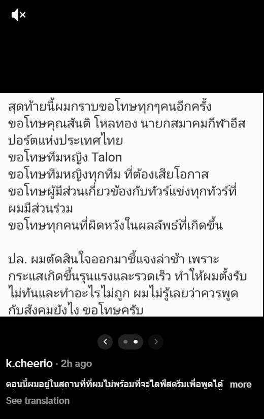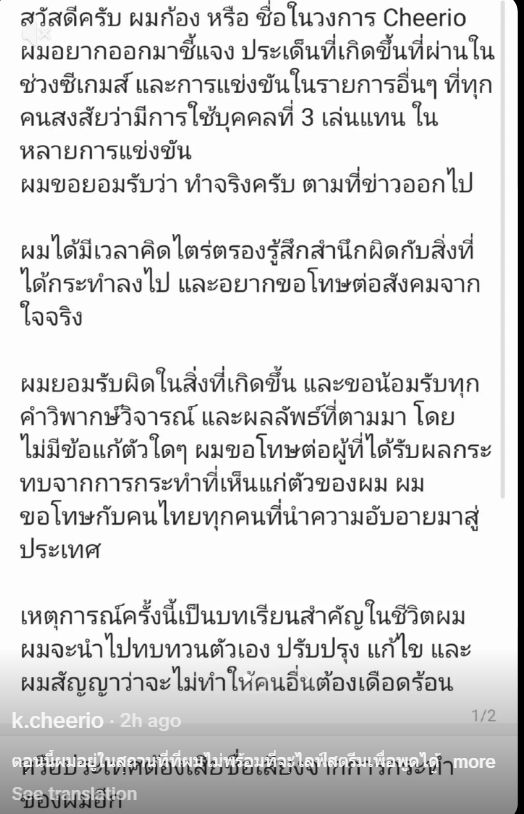 หลังจากมีกรณีร้อนแรงสั่นคลอนวงการอีสปอร์ตไทยกับข่าวทีมชาติหญิง RoV อย่าง Tokyogurl ถูกจับได้กลางงานแข่ง SEA Games 2025 ว่ามีการพยายามลงโปรแกรมที่ไม่เกี่ยวข้องและหลายคนเชื่อว่าที่ผ่านมาน่าจะมีการให้บุคคลที่ 3 เล่นแทนหรือที่มักจะใช้กันว่า มีสแตนด์อินเล่นแทน ล่าสุดวันนี้มีความเคลื่อนไหวจากผู้ที่เกี่ยวข้องออกมาแล้ว นั่นก็คือ Cheerio หรือ ก้อง ผู้เล่น RoV ชายที่ถูกลืออย่างหนักมาก่อนหน้านี้ ในฐานะผู้ต้องสงสัยว่าเป็นสแตนด์อินให้กับ Tokyogurl โดย Cheerio ได้โพสต์ผ่าน TikTok ยอมรับว่าตนเองคือ สแตนด์อินที่ลงเล่นแทน Tokyogurl ผู้เล่นทีมชาติไทยในรายการ SEA Games 2025 และรายการแข่งขันอื่น ๆ จริงตามข่าวลือ โดยขอโทษทุกคน ๆ ตามเนื้อหาดังด้านล่าง
